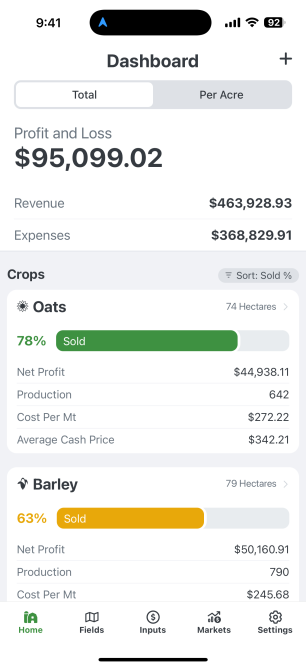 Designed to give farmers greater visibility into their business operations, the platform features key tools such as grain inventory tracking, financial reports, and cost-of-production metrics—allowing users to assess performance at a glance.